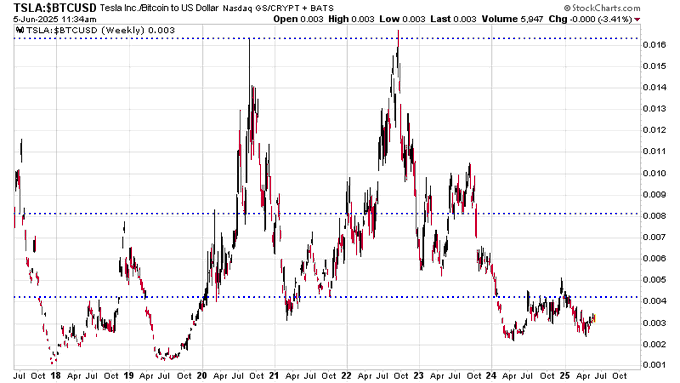 But by mid-2022, the ratio peaked and began a sharp descent. The zone he had once dubbed “RIP TSLA” wasn’t a joke — Tesla’s BTC ratio plunged from over 0.015 to just 0.003 as of June 2025.